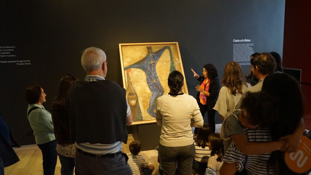 Nuestro equipo de educación te invita a ser parte del recorrido mediado “El folclor de Chile según Violeta”, que invita a conocer el trabajo de investigación, recopilación y creación desarrollado por la artista en torno a las expresiones culturales del país. A través de las salas «Canto a lo Humano» y «Canto a lo Divino», podrás acercarte a la mirada de Violeta sobre el folclor como práctica viva, dinámica y profundamente ligada a las comunidades.